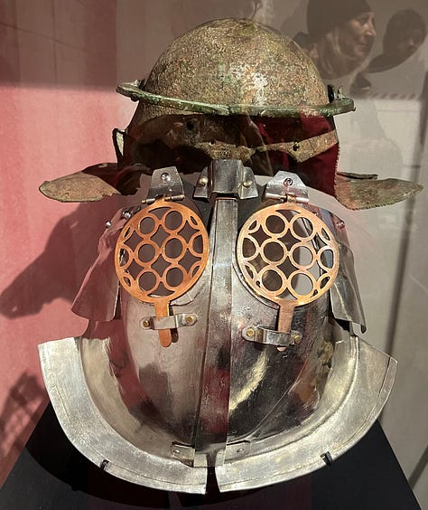 The helmets in the centre (original and reconstructed) show that design of gladiator armour was more for effect than practicality. Not how I would want to be protected.