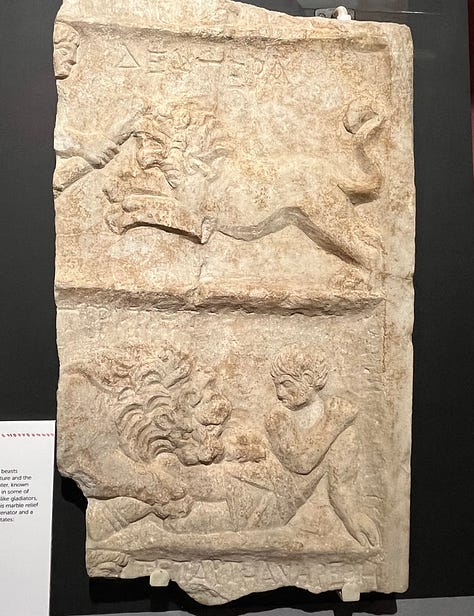Finally, the panel on the right shows a likely fate if you were a slow or fat gladiator, or a prisoner condemned ad bestias. On being fat, by the way, recent research finds that gladiators were fed a carb-heavy diet, mostly barley, intended to add layers of fat. The fat offered some protection against sword slashes, while allowing for spectacular bleeding. Useful to know for Quintus Valerius mystery #6, The Dead Gladiator, to be set in London. When I catch my breath.